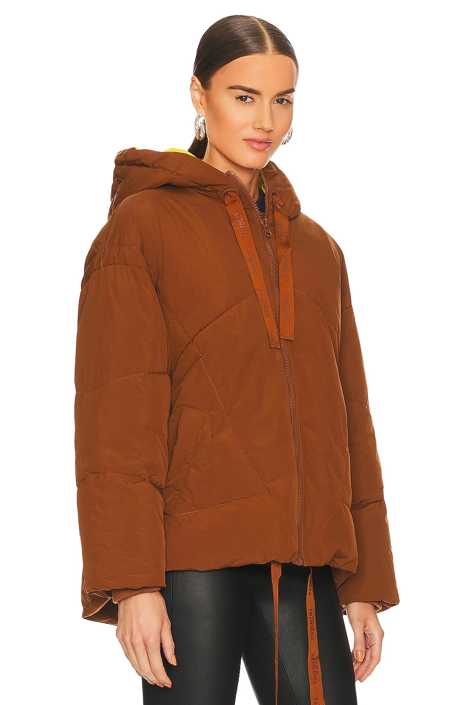 Self: 100% recycled polyamide.Filling: 100% recycled polyester. Made in China. Machine wash. Front zipper closure. Side slant pockets. Attached hoodie. Midweight padded ripstop fabric. Revolve Style No. ESSE-WO26. Manufacturer Style No. Chameleon.